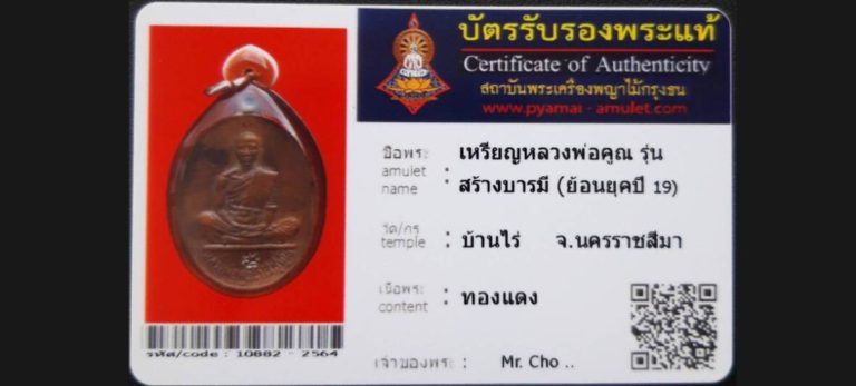 บัตรที่ผ่านการรับรองไม่มีหมวดหมู่ เหรียญหลวงพ่อคูณ รุ่นสร้างบารมี วัดบ้านไร่ จ.นครราชสีมา เจ้าของพระ Mr.Cho.. รหัสบัตร 10882 – 2564