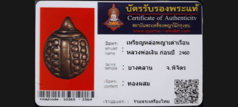 บัตรที่ผ่านการรับรองไม่มีหมวดหมู่ เหรียญหล่อพญาเต่าเรือนหลวงพ่อเงิน วัดบางคลาน จ.พิจิตร เจ้าของพระ ร้านพระเครื่องไทย รหัสบัตร 10265 – 2564