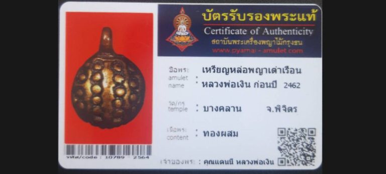 บัตรที่ผ่านการรับรองไม่มีหมวดหมู่ เหรียญหล่อพญาเต่าเรือน หลวงพ่อเงิน วัดบางคลาน จ.พิจิตร เจ้าของพระ คุณแดนนี่ หลวงพ่อเงิน รหัสบัตร 10789 – 2564