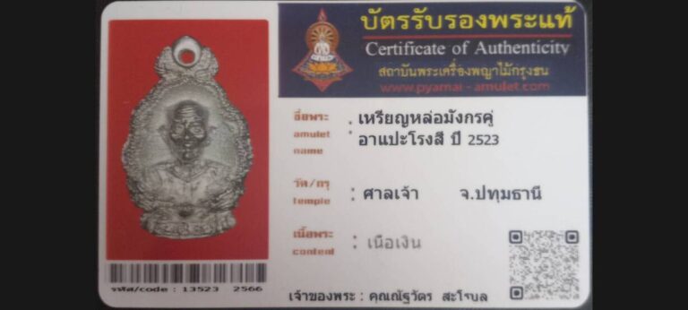 บัตรที่ผ่านการรับรอง (ซ่อน) เหรียญหล่อมังกรคู่ อาแปะโรงสี วัดศาลเจ้า จ.ปทุมธานี เจ้าของพระ คุณณัฐวัตร สะโรมล รหัสบัตร 13523 – 2566