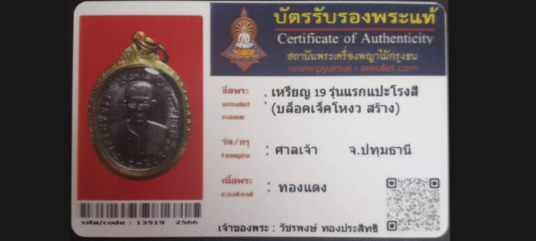 บัตรที่ผ่านการรับรอง (ซ่อน) เหรียญ 19 รุ่นแรกแปะโรงสี (บล็อคเจ็คโหงว สร้าง) วัดศาลเจ้า จ.ปทุมธานี เจ้าของพระ คุณวัชรพงษ์ ทองประสิทธิ รหัสบัตร 13519 – 2566