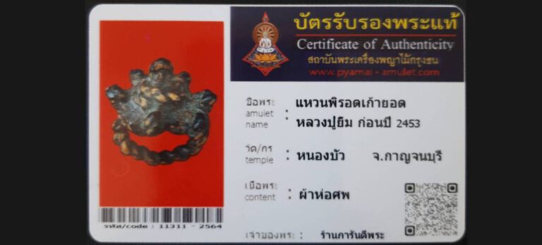 บัตรที่ผ่านการรับรองไม่มีหมวดหมู่ แหวนพิรอดเก้ายอดหลวงปู่ยิ้ม วัดหนองบัว จ.กาญจนบุรี เจ้าของพระ ร้านการันตีพระ รหัสบัตร 11311 – 2564