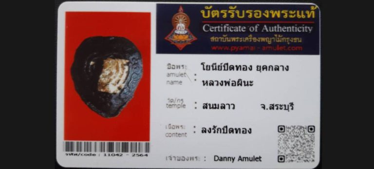 บัตรที่ผ่านการรับรองไม่มีหมวดหมู่ โยนีย์ปิดทอง ยุคกลาง หลวงพ่อผินะ วัดสนมลาว จ.สระบุรี เจ้าของพระ Danny Amulet รหัสบัตร 11042 – 2564