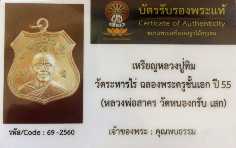 บัตรรับรองพระแท้ เหรียญหลวงปู่ทิม